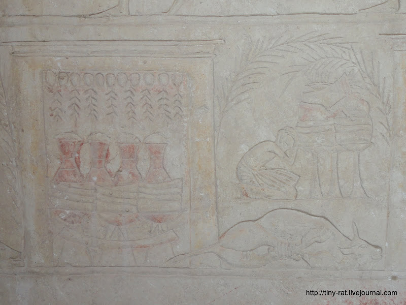Как я сказала, гробниц очень много, но со скульптурами в стене я больше не видела. В основном, на стенах были плоские рельефы, но иногда встречались рисунки, разной степени завершенности и сохранности. Тематика рельефов похожая - погребальные сцены и сцены из повседневной жизни Древнего царства.